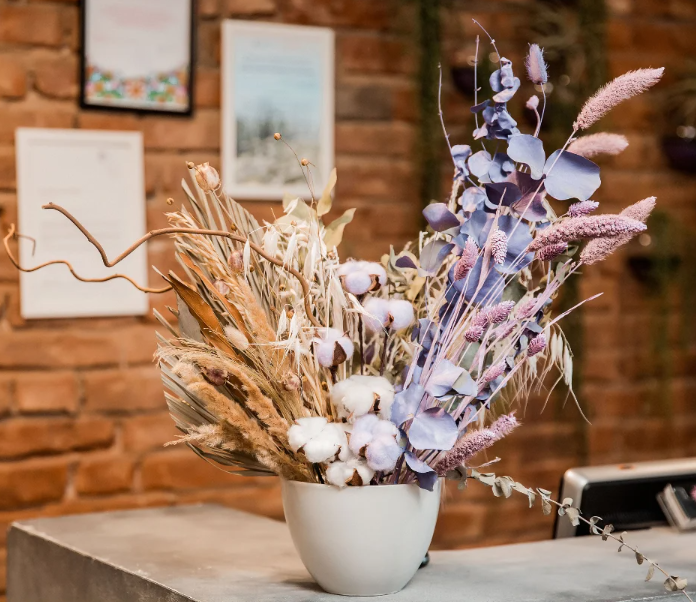 A soft, romantic mix of white roses, lavender, and greenery, creating a dreamy garden feel.